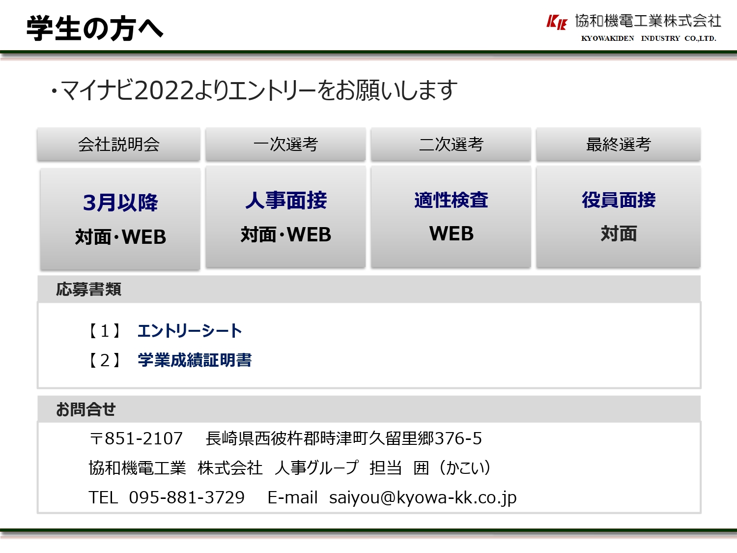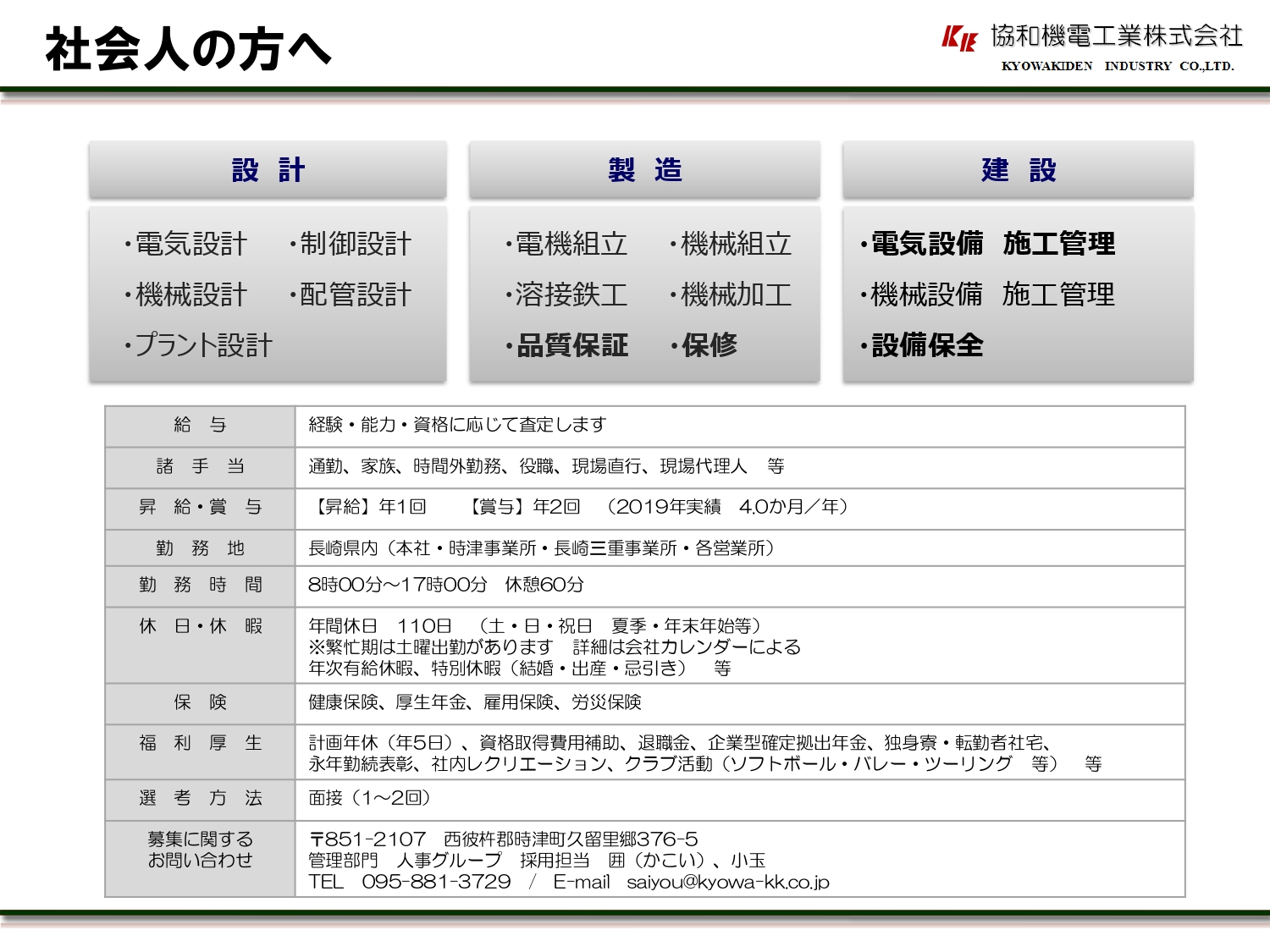 | 連絡先 | 〒851-2107 長崎県西彼杵郡時津町久留里郷376-5 協和機電工業株式会社 人事グループ 担当 囲(かこい) TEL:095-881-3729 E-mail:saiyou@kyowa-kk.co.jp |